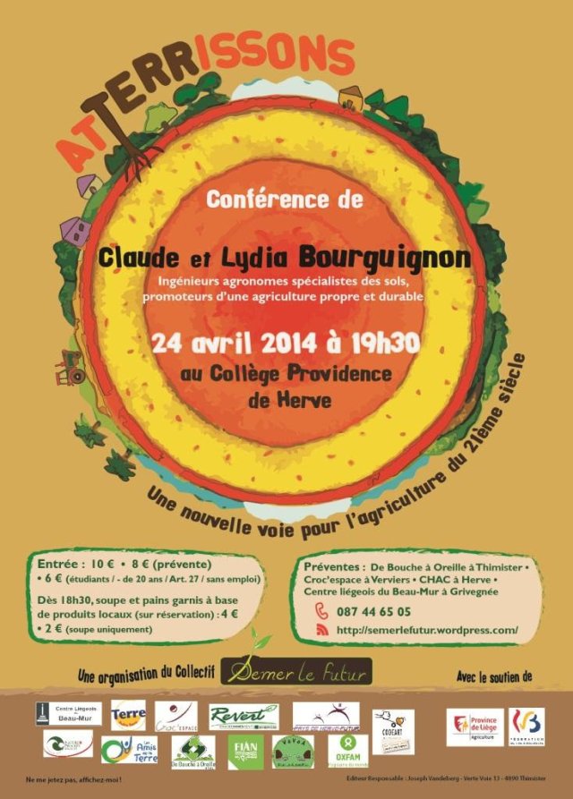 – Le 24 Avril : Le collectif « Semer le futur » vous invite à rencontrer Lydia et Claude Bourguignon, le jeudi 24 avril prochain à 19h30, au Collège de la Providence de Herve. Ces agronomes que l’on a pu voir dans des films comme « Nos enfants nous accuseront », invitent à un autre questionnement face à l’exploitation des sols.