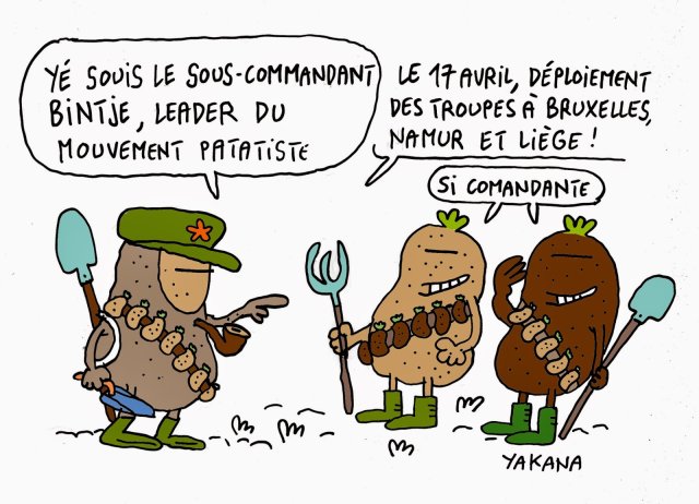 Nous nous sommes rassemblés en divers endroits le 17 avril pour réclamer l’accès à la terre pour les paysans. Nous avons inauguré l’idée de planter des patates au nom de notre avenir alimentaire à toutes et tous, pour montrer que nous nous organisons déjà pour notre souveraineté alimentaire. C’est depuis cette année que la patate, symbole de l’action, est devenu notre symbole de la lutte pour la souveraineté alimentaire !