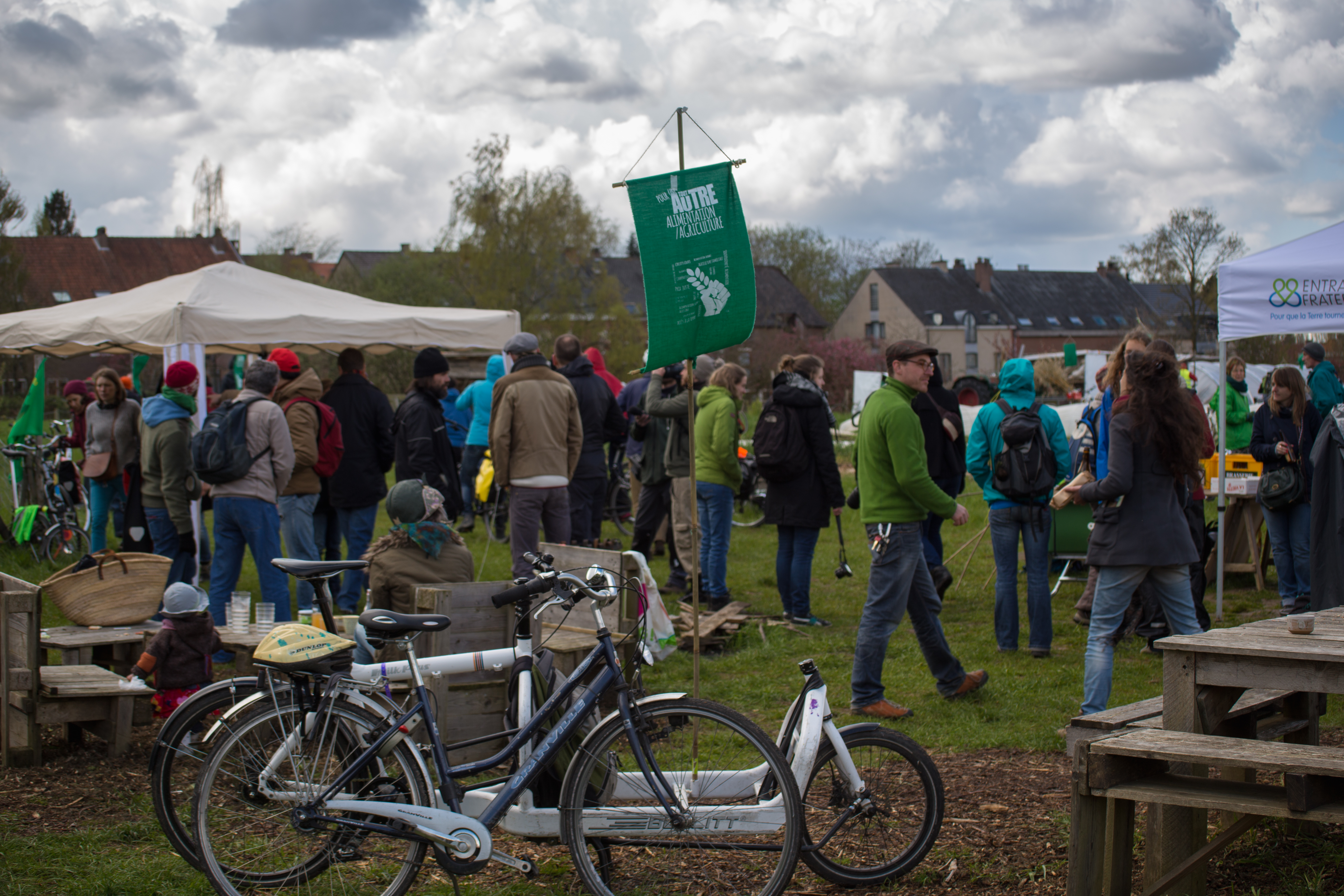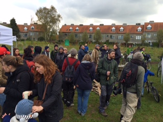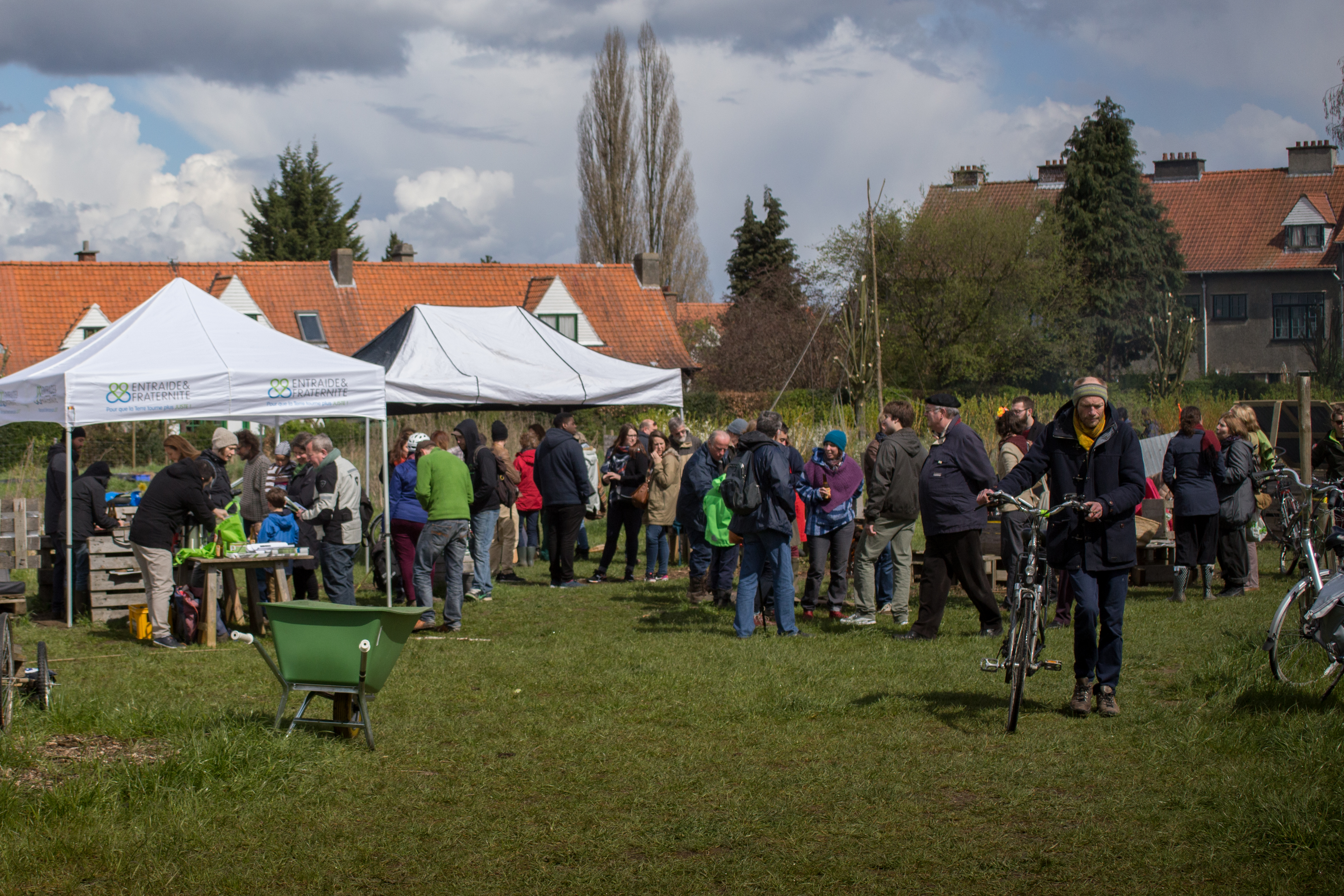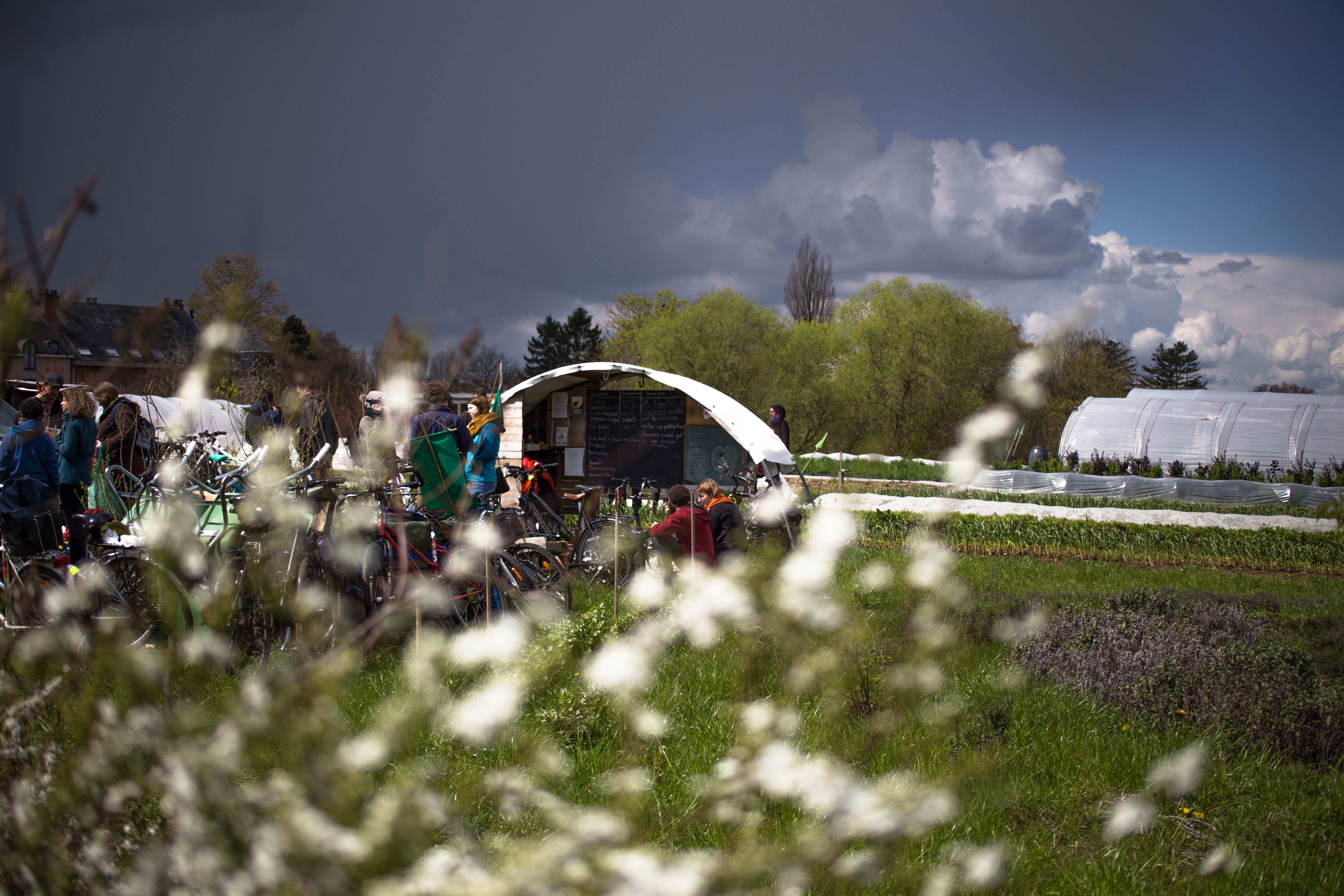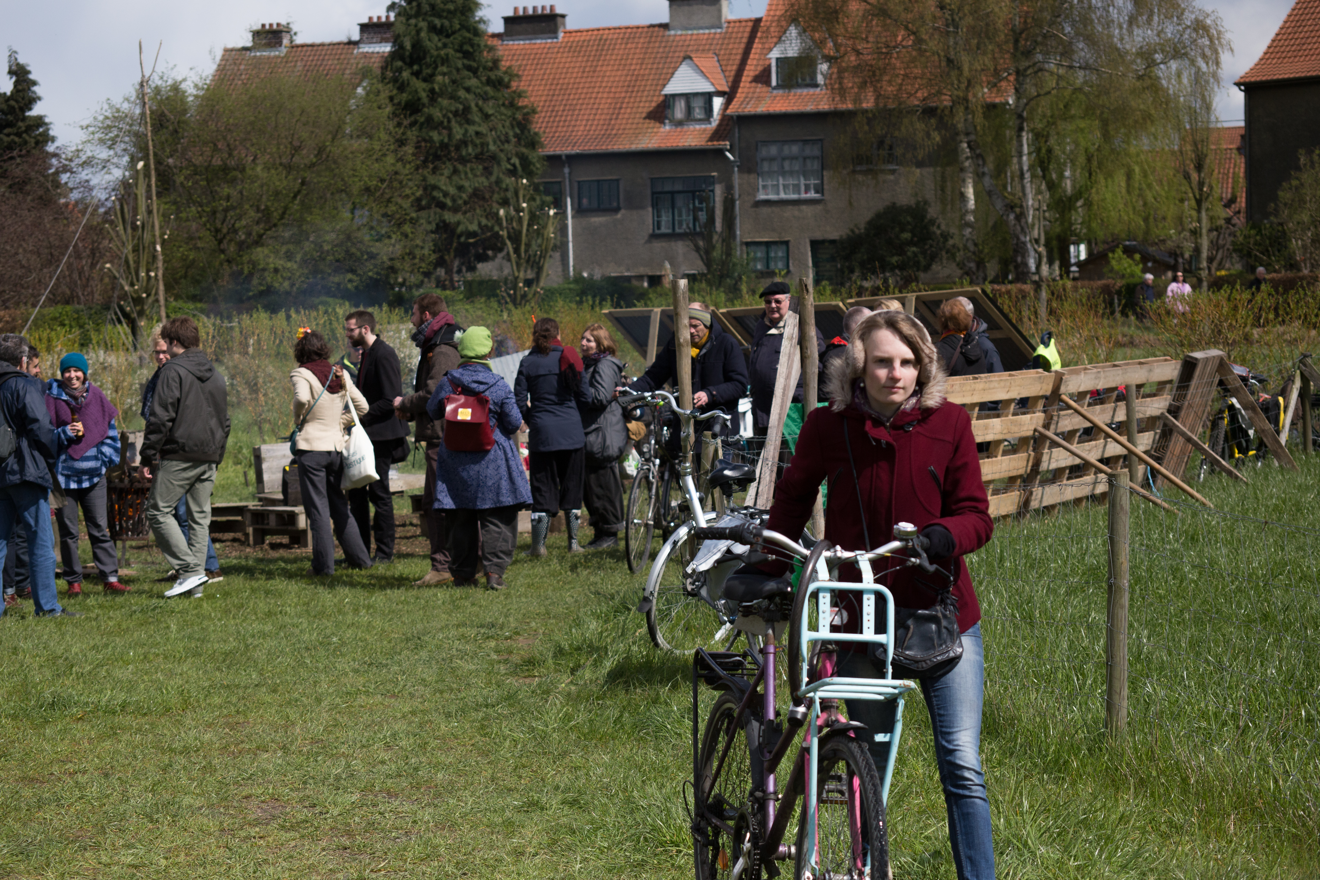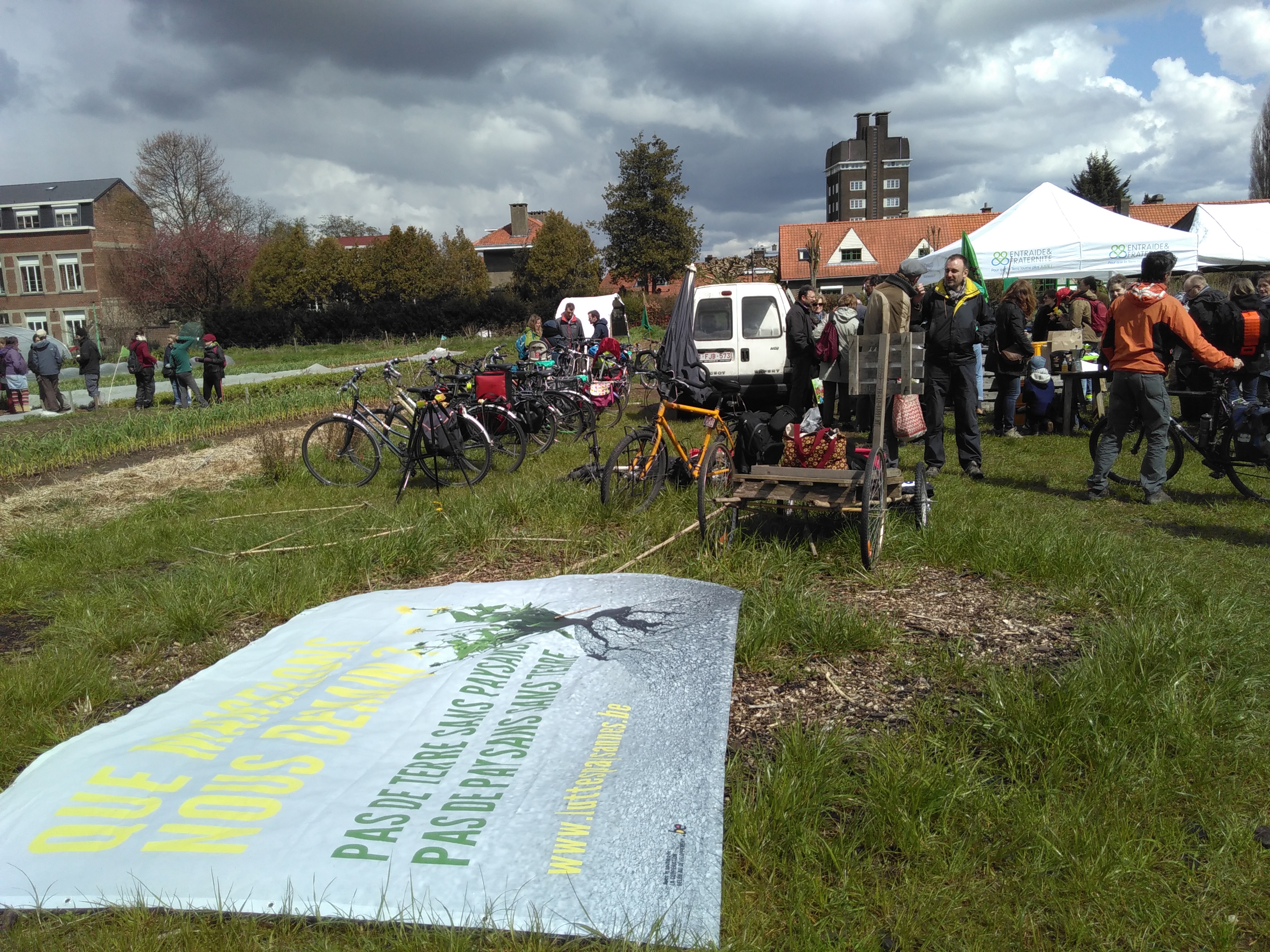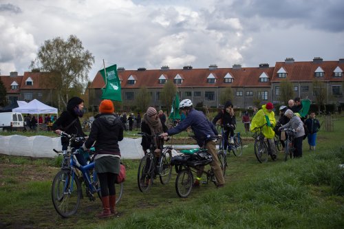 Très belle journée ce dimanche 17 avril à Bruxelles. Les cyclistes qui se sont retrouvés aux Dames Blanches à Woluwé-Saint-Pierre à 11h ont découvert un terrain de 9 Ha plein de promesses. Ensuite traversée de la forêt de Soignes avec 50 cyclistes pour rejoindre Boitsfort où nous avons pique-niqué, entre deux averses, au Chant des Cailles. Bel accueil des Boitsfortois passionnés par leur projet. Ensuite, nous avons rejoint Haren par la voie verte, soit les 3/4 des 14 km dans la verdure ! L’ancien chemin de fer de Demey au Stade Fallon, Off ter Musschen, les champs de St Stevens Woluwé... Arrivée à 16h à Haren au Keelbeeck où l’on a eu un pincement au coeur de voir le terrain tout grillagé. Heureusement qu’on a pu planter quelques patates dans les jardins "autorisés"... Le forum potagiste fut un moment fort de la journée, avec de nombreux représentants de potagers collectifs de la capitale et quelques agriculteurs wallons. La fanfare du Docteur Poelpack a coloré le repas du soir. Ensuite on s’est réchauffés dans le CC De Linde avec le bintje orchestra.
