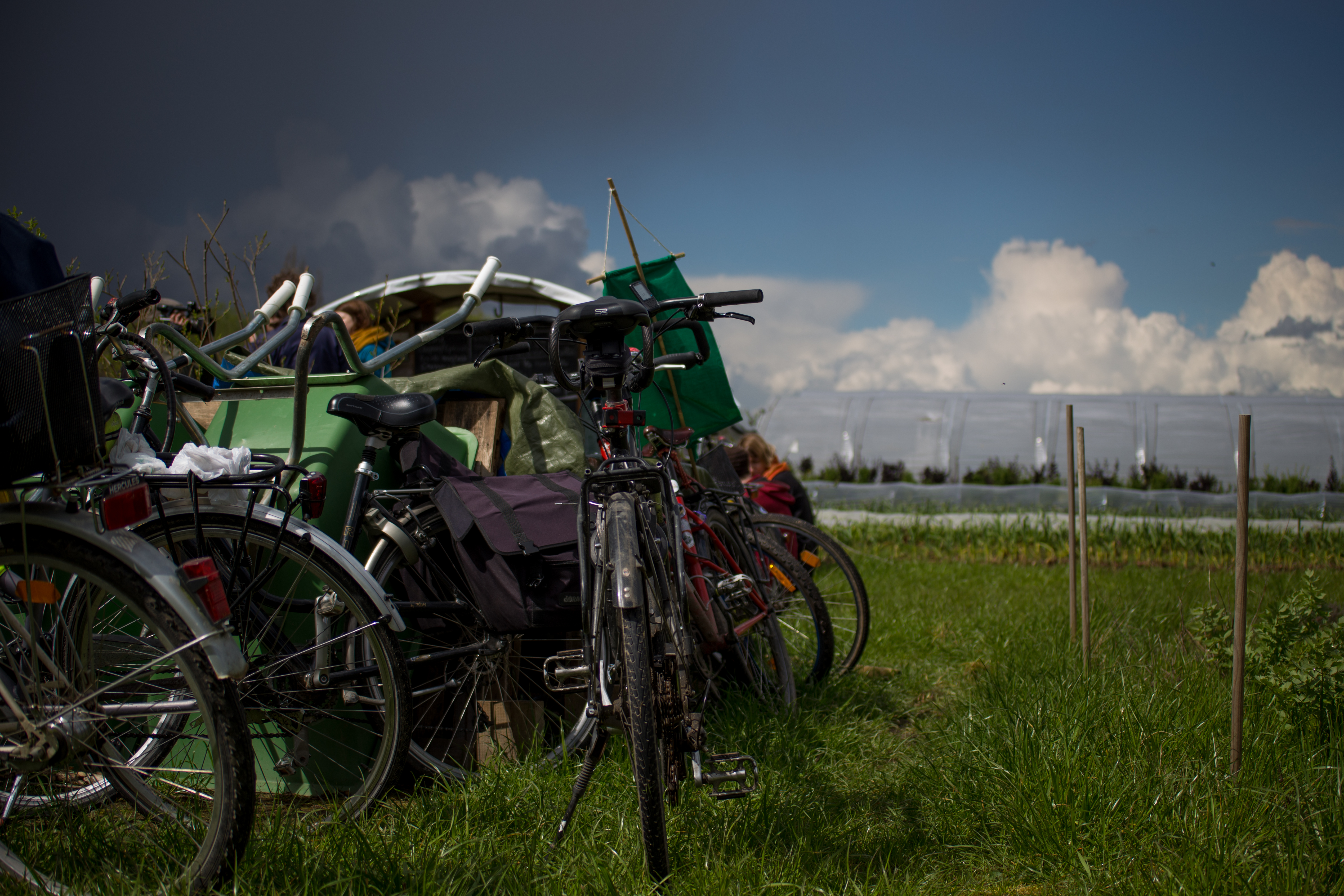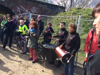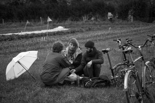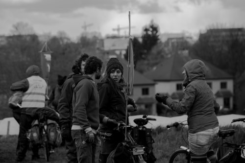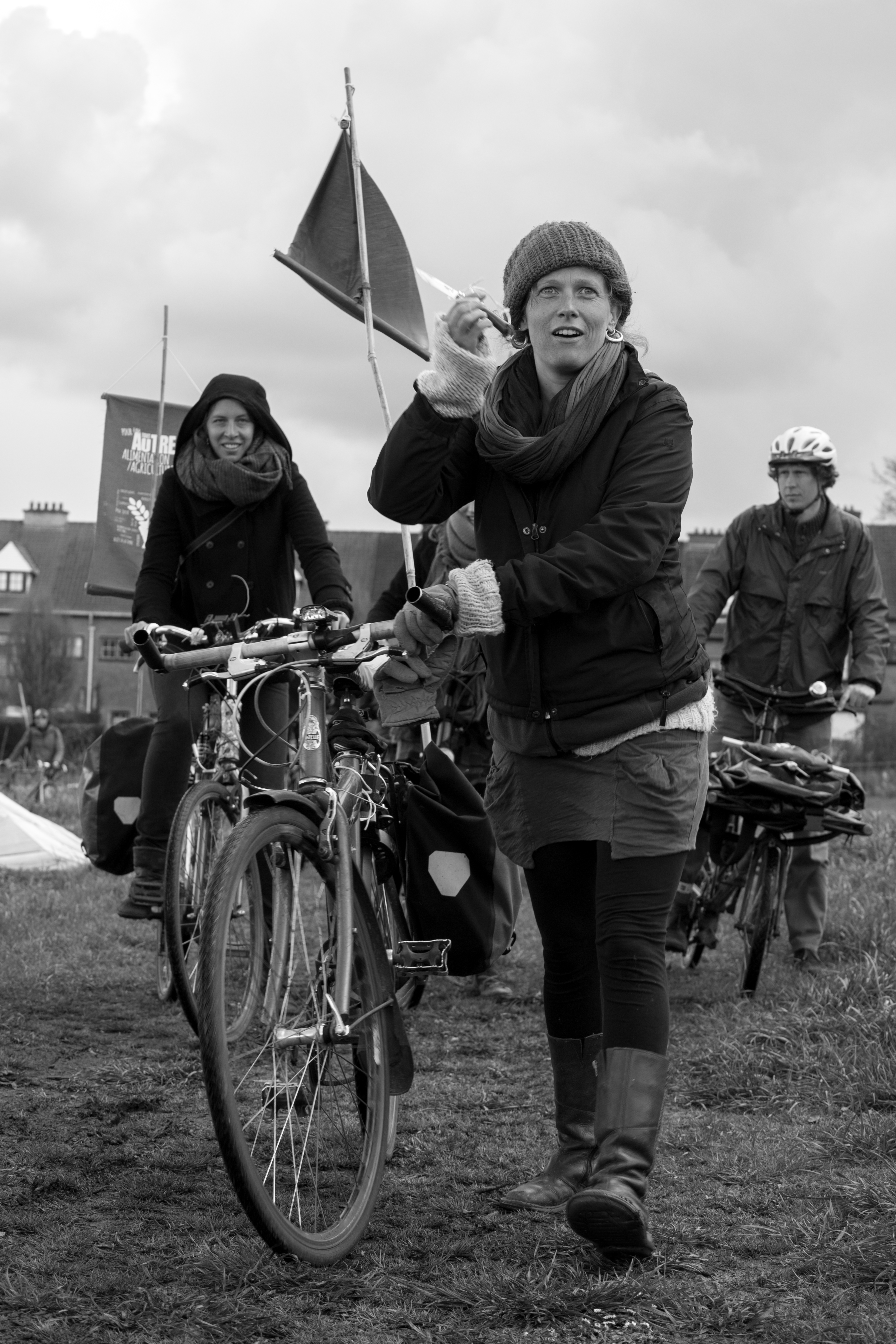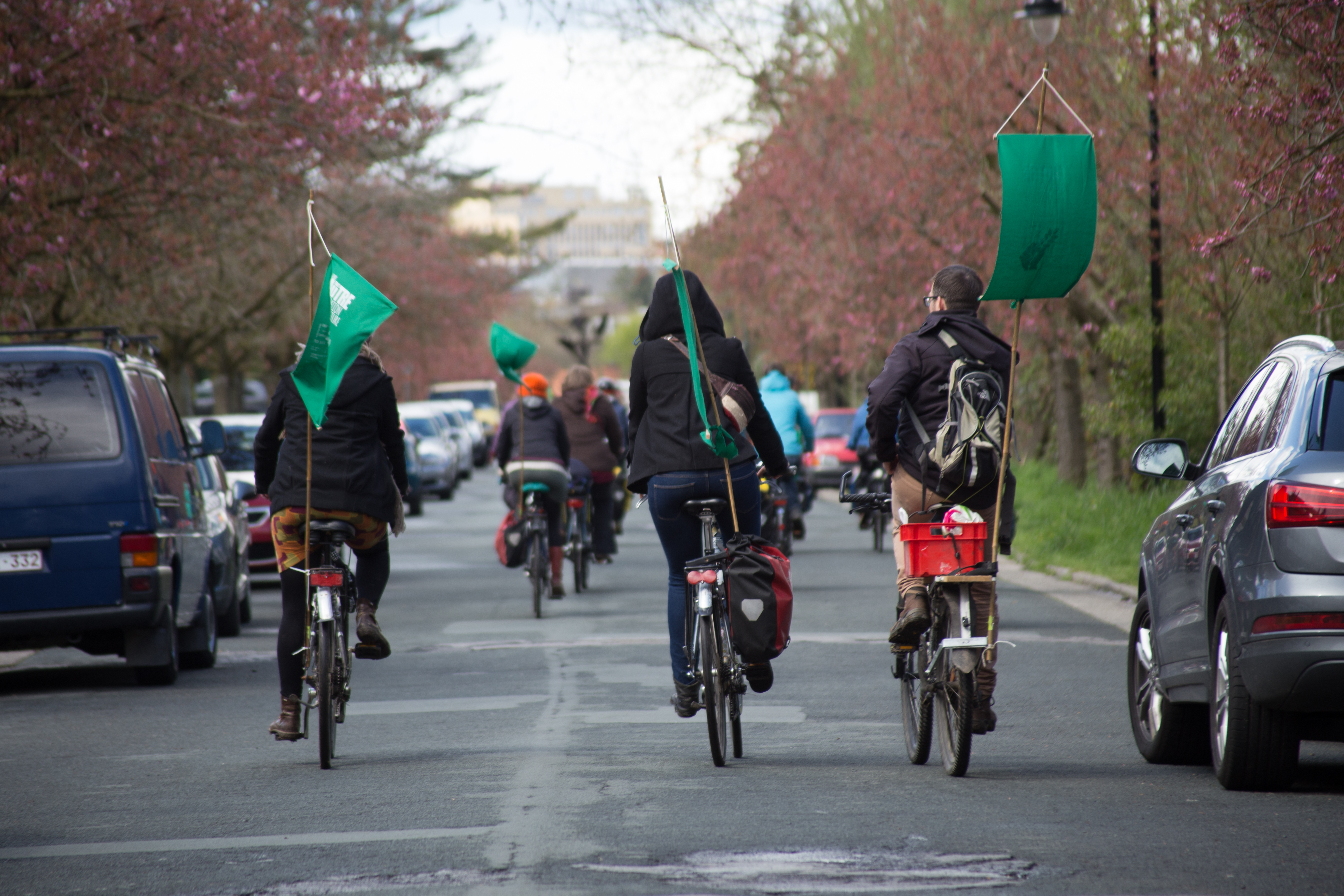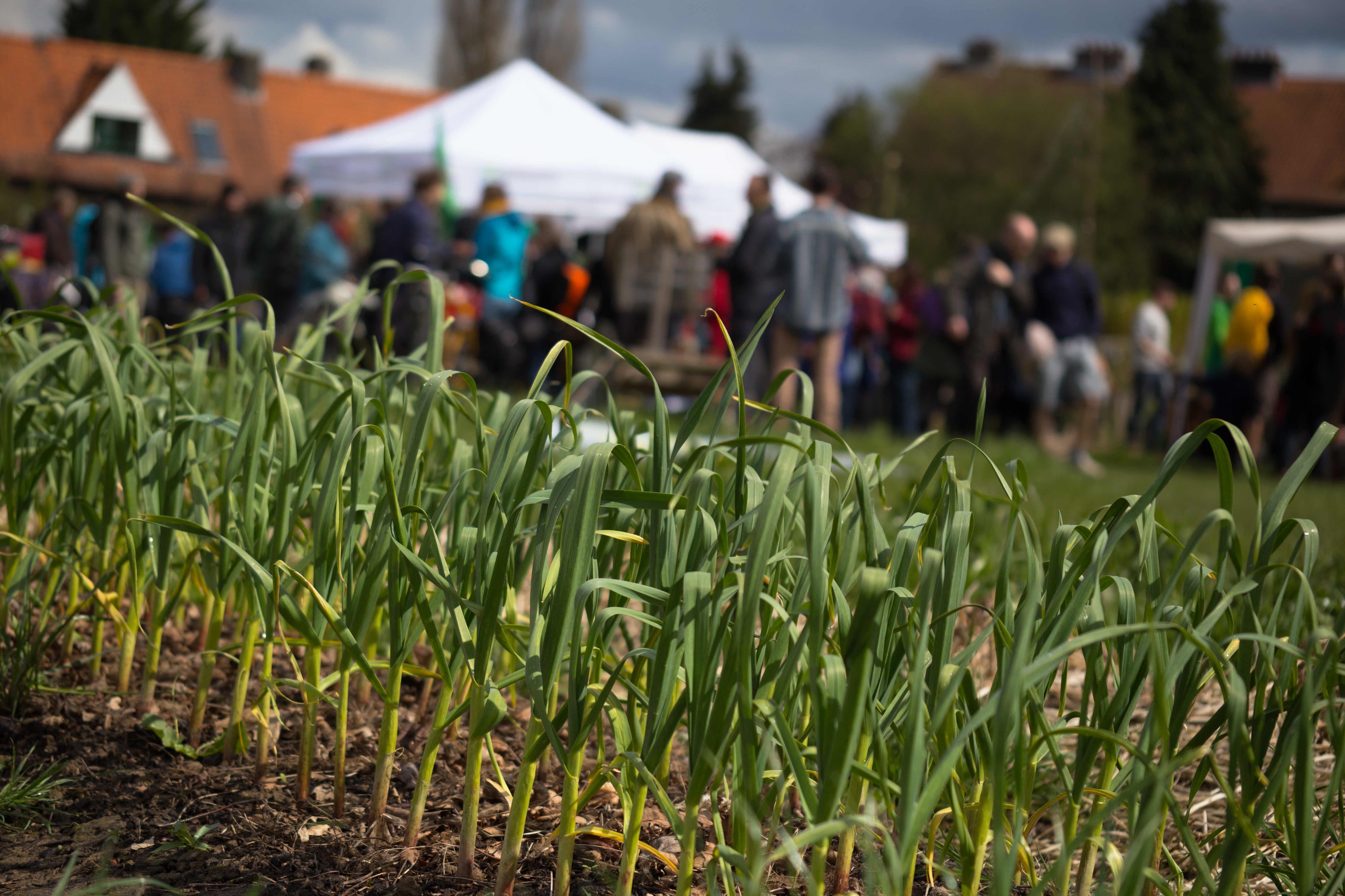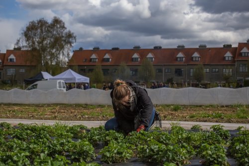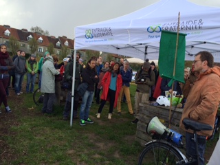 Très belle journée ce dimanche 17 avril à Bruxelles. Les cyclistes qui se sont retrouvés aux Dames Blanches à Woluwé-Saint-Pierre à 11h ont découvert un terrain de 9 Ha plein de promesses. Ensuite traversée de la forêt de Soignes avec 50 cyclistes pour rejoindre Boitsfort où nous avons pique-niqué, entre deux averses, au Chant des Cailles. Bel accueil des Boitsfortois passionnés par leur projet. Ensuite, nous avons rejoint Haren par la voie verte, soit les 3/4 des 14 km dans la verdure ! L’ancien chemin de fer de Demey au Stade Fallon, Off ter Musschen, les champs de St Stevens Woluwé... Arrivée à 16h à Haren au Keelbeeck où l’on a eu un pincement au coeur de voir le terrain tout grillagé. Heureusement qu’on a pu planter quelques patates dans les jardins "autorisés"... Le forum potagiste fut un moment fort de la journée, avec de nombreux représentants de potagers collectifs de la capitale et quelques agriculteurs wallons. La fanfare du Docteur Poelpack a coloré le repas du soir. Ensuite on s’est réchauffés dans le CC De Linde avec le bintje orchestra.