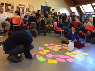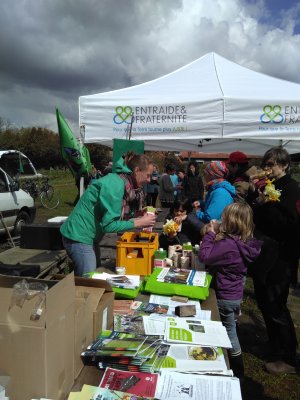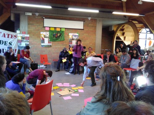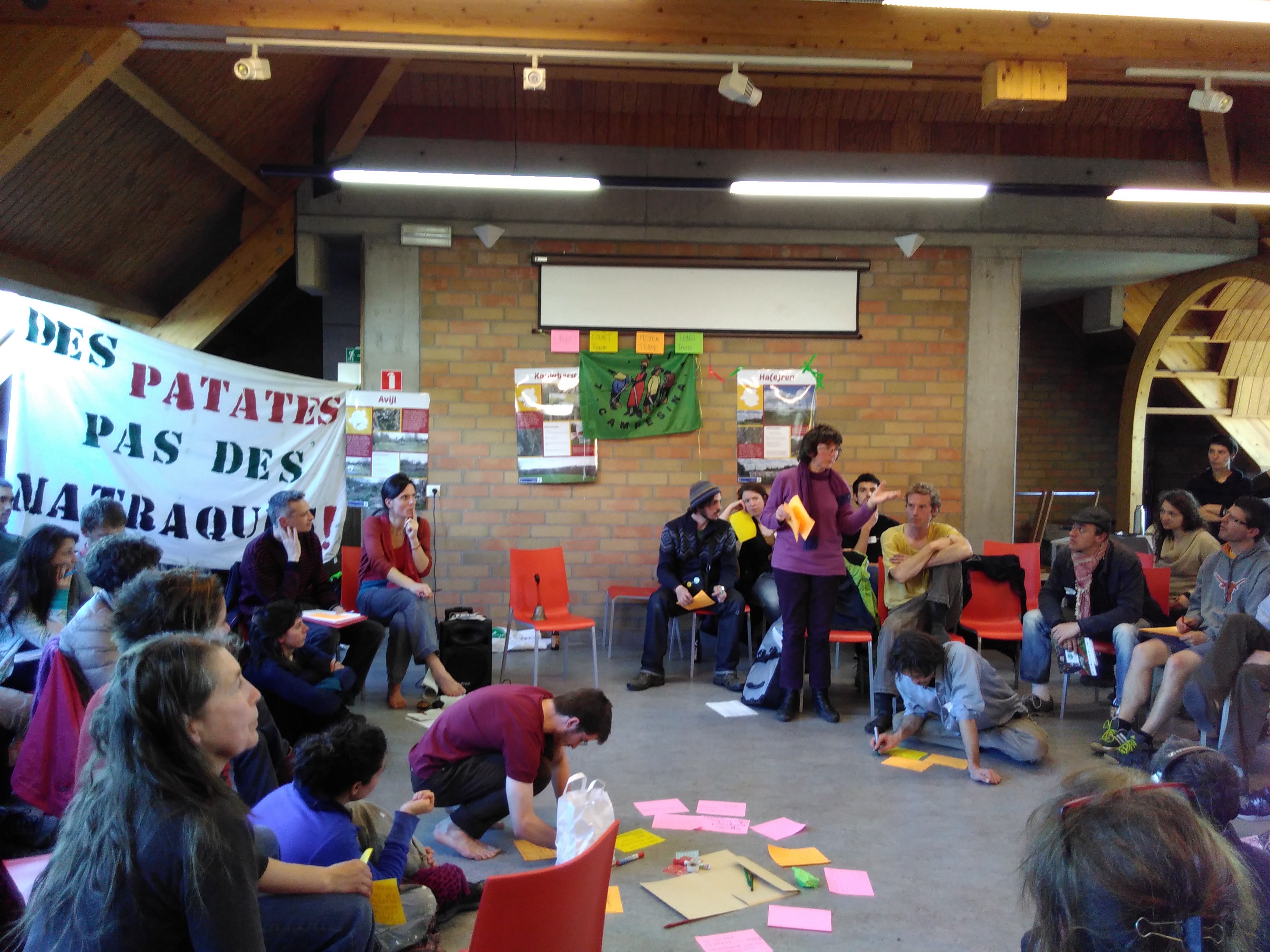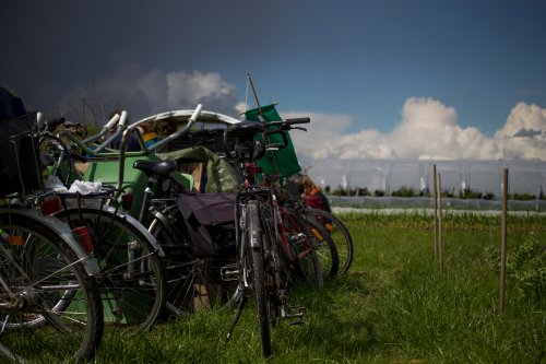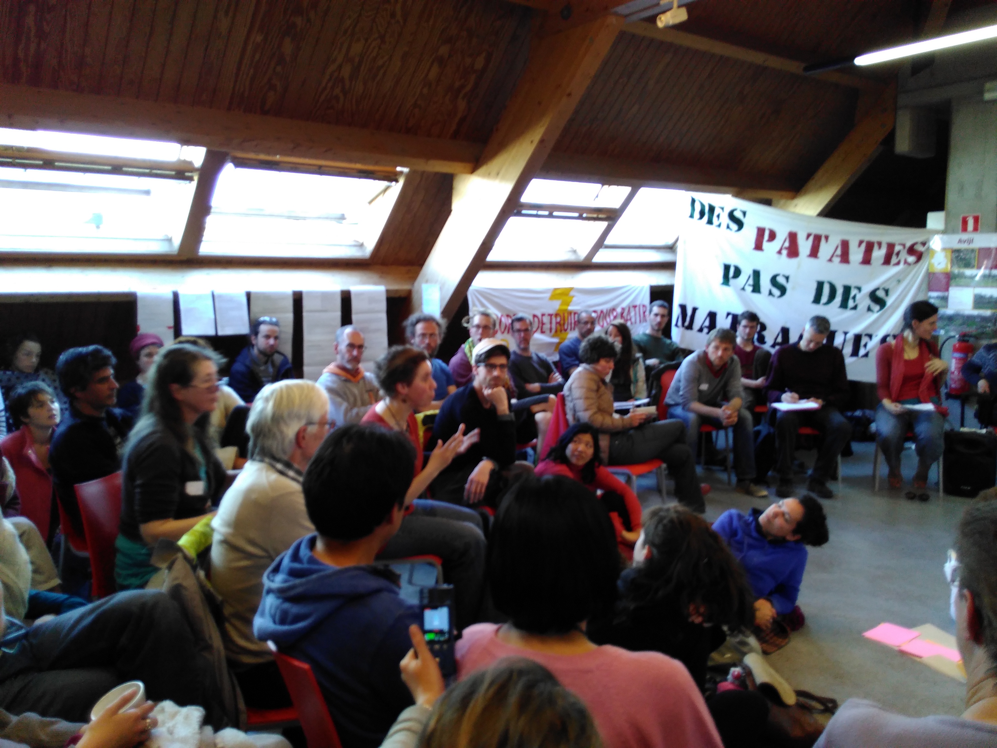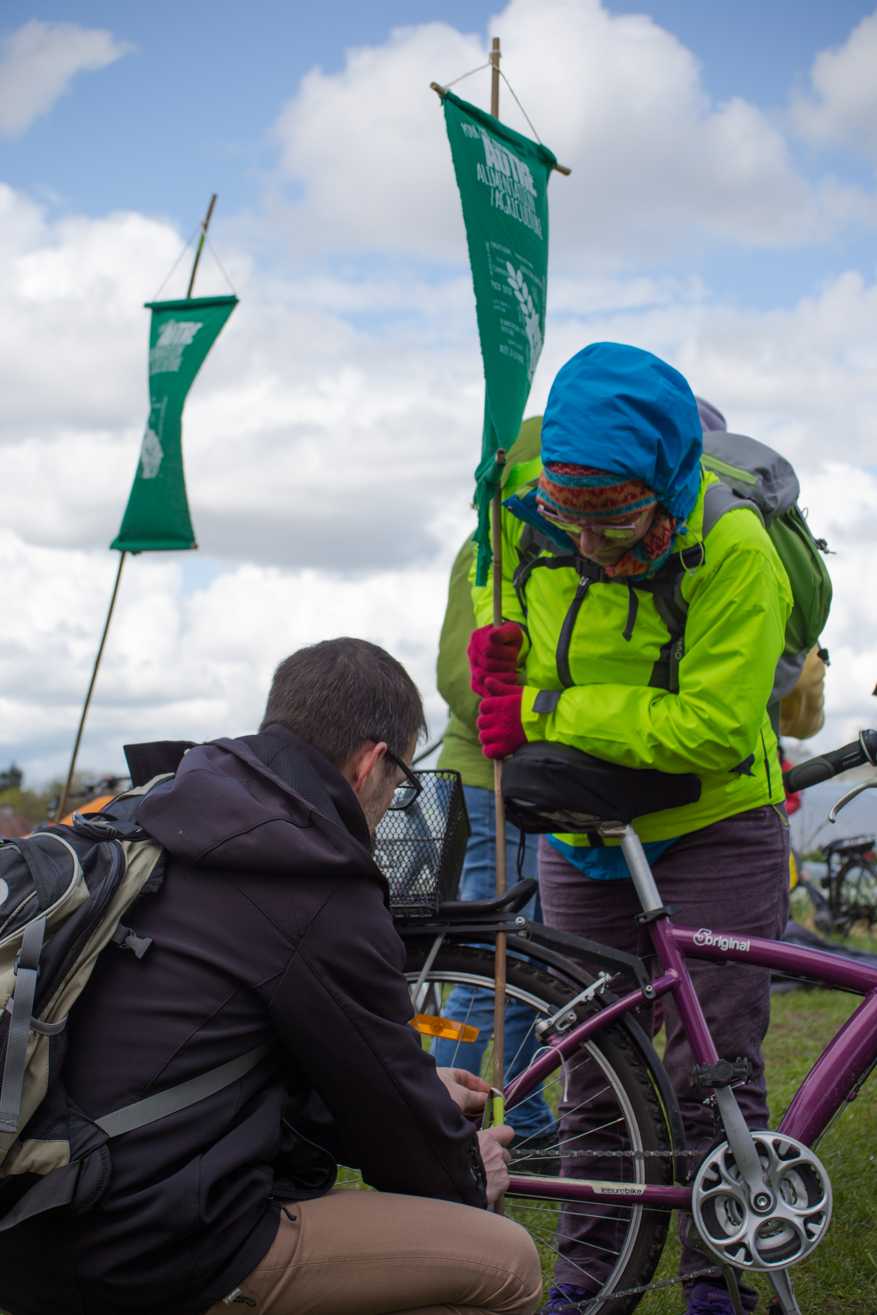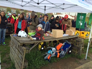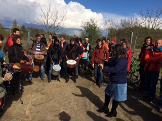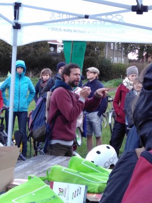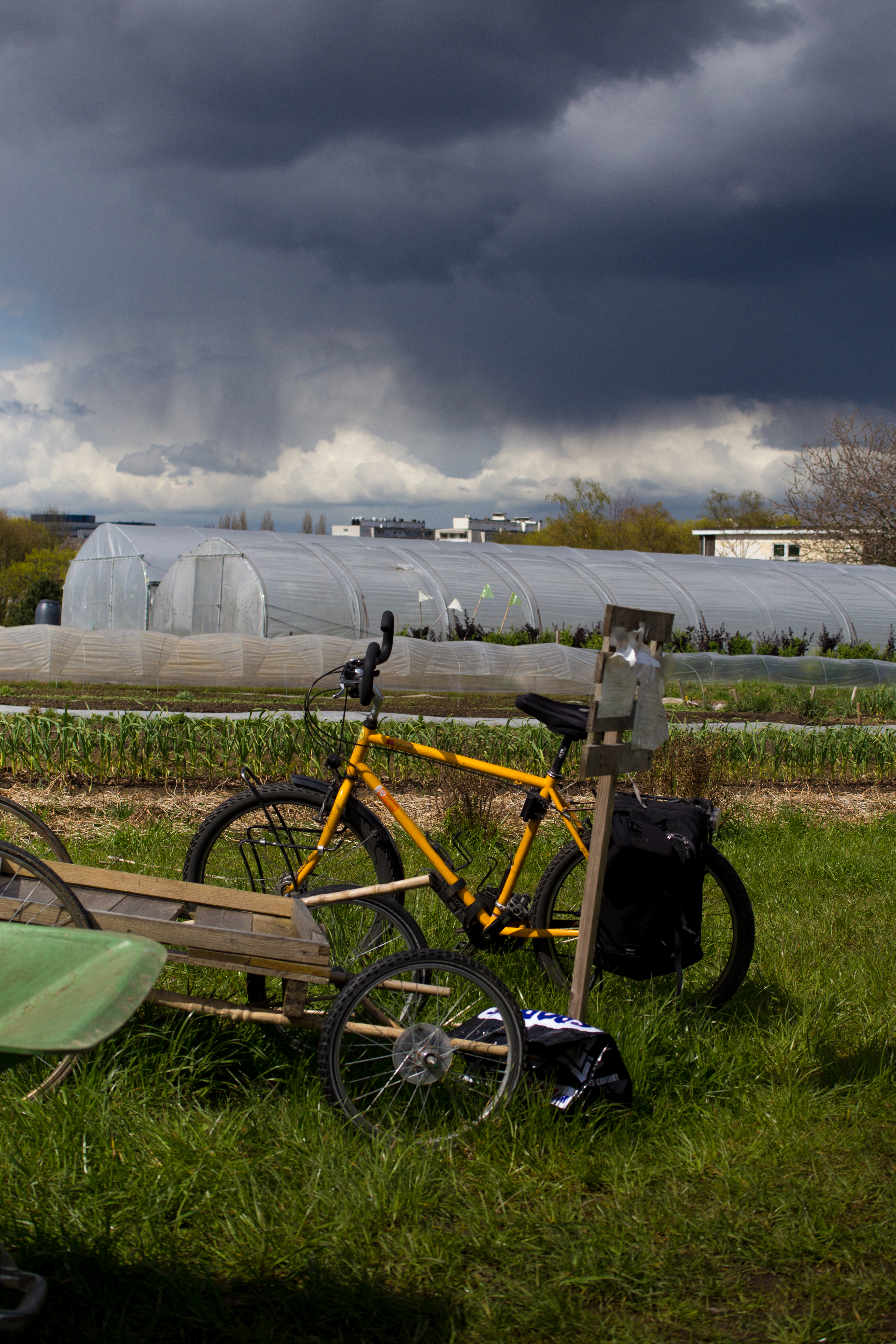 Très belle journée ce dimanche 17 avril à Bruxelles. Les cyclistes qui se sont retrouvés aux Dames Blanches à Woluwé-Saint-Pierre à 11h ont découvert un terrain de 9 Ha plein de promesses. Ensuite traversée de la forêt de Soignes avec 50 cyclistes pour rejoindre Boitsfort où nous avons pique-niqué, entre deux averses, au Chant des Cailles. Bel accueil des Boitsfortois passionnés par leur projet. Ensuite, nous avons rejoint Haren par la voie verte, soit les 3/4 des 14 km dans la verdure ! L’ancien chemin de fer de Demey au Stade Fallon, Off ter Musschen, les champs de St Stevens Woluwé... Arrivée à 16h à Haren au Keelbeeck où l’on a eu un pincement au coeur de voir le terrain tout grillagé. Heureusement qu’on a pu planter quelques patates dans les jardins "autorisés"... Le forum potagiste fut un moment fort de la journée, avec de nombreux représentants de potagers collectifs de la capitale et quelques agriculteurs wallons. La fanfare du Docteur Poelpack a coloré le repas du soir. Ensuite on s’est réchauffés dans le CC De Linde avec le bintje orchestra.
