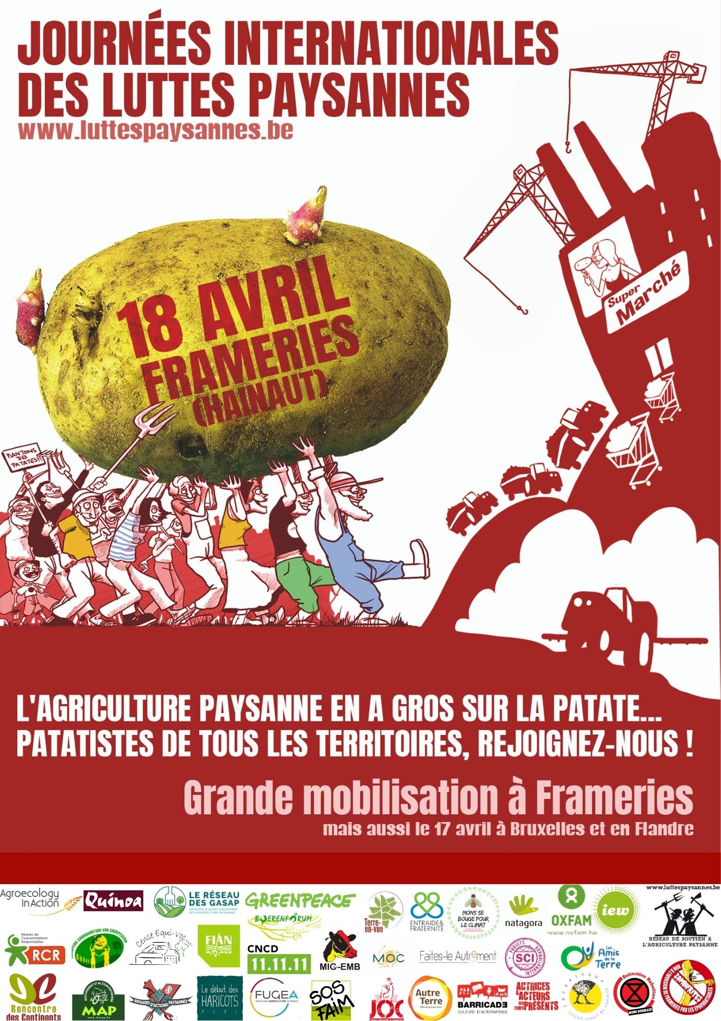 1. Une Mobilisation à Frameries : Le 18, de 10h30 à 15h30, rassemblement - plantation de patates biologiques sur des terres rachetées par l’industrie - assemblée et rencontre d’acteur.ice.s en lutte contre l’agro-industrie- Théatre Action - Jeux patatistes - Grignotages à emporter (à confirmer). Inscriptions (obligatoires) ICI