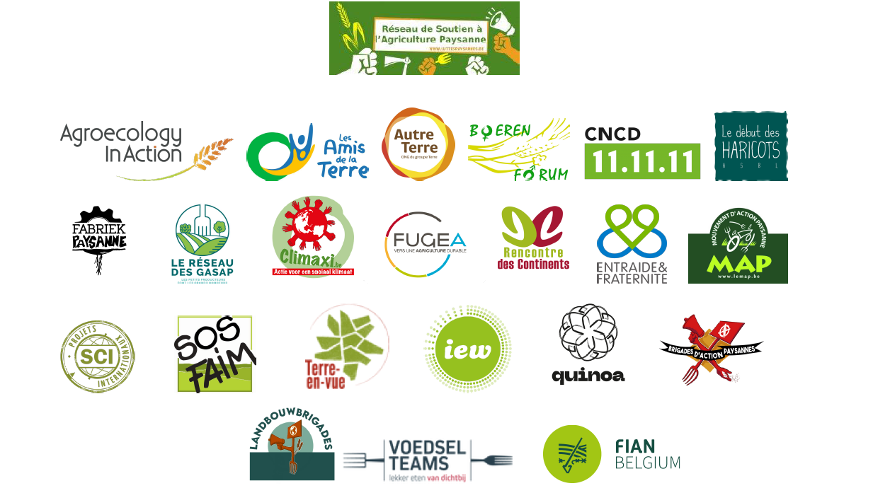 Enfin, cette mobilisation s’inscrit dans le cadre de la journée mondiale des luttes paysannes. Comme chaque année, le RESAP prend comme porte d’entrée des luttes locales qui ont une portée internationale. Lutter contre les mécanismes développés par l’agro-industrie en Belgique pour renforcer sa mainmise sur les systèmes alimentaires, c’est aussi lutter contre le déploiement de ces mécanismes ailleurs dans le monde et particulièrement dans les pays du Sud. Pour lutter contre les accaparements de terres dans les pays du Sud, la Belgique doit faire sa part. Notamment :