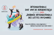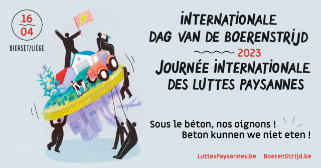 | Le 17 avril 1996, dix-neuf paysans du mouvement des sans-terre au Brésil étaient assassinés par des tueurs à la solde de grands propriétaires terriens. En mémoire de leur combat, le mouvement paysan international La Via Campesina fait du 17 avril la "Journée internationale des luttes paysannes". Chaque année des actions de solidarité avec les paysan.ne.s sont menées aux quatre coins de la planète. En Belgique, à cette occasion, le Réseau de Soutien à l’Agriculture Paysanne (ReSAP) organise des mobilisations depuis une dizaine d’années. Ces actions sont une opportunité pour les mouvements paysans et leurs alliés d’apporter un soutien à des luttes concrètes pour la protection des terres agricoles et contre des projets destructeurs de l’agriculture paysanne et nourricière. Ce fut notamment le cas :