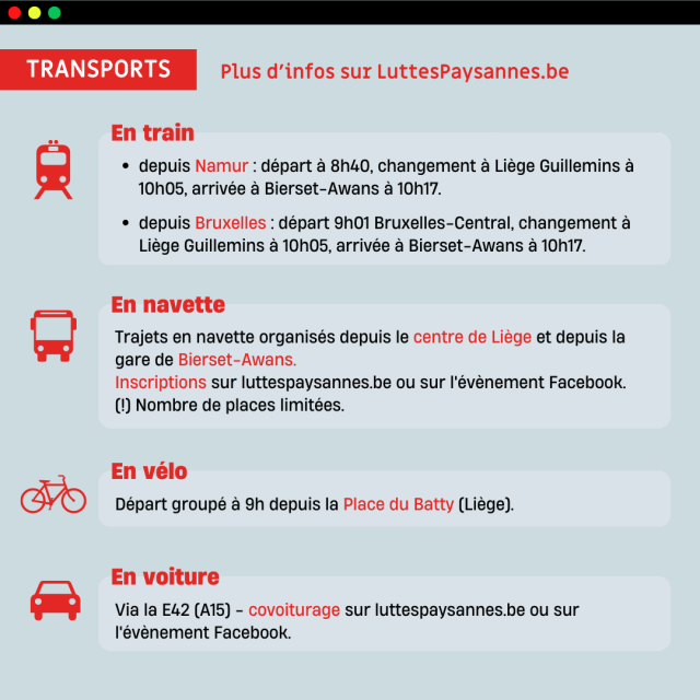 Une navette en car sera organisée depuis le centre de Liège ; et les autres depuis la gare de Bierset-Awans. Merci de t’inscrire ICI pour faciliter notre organisation !