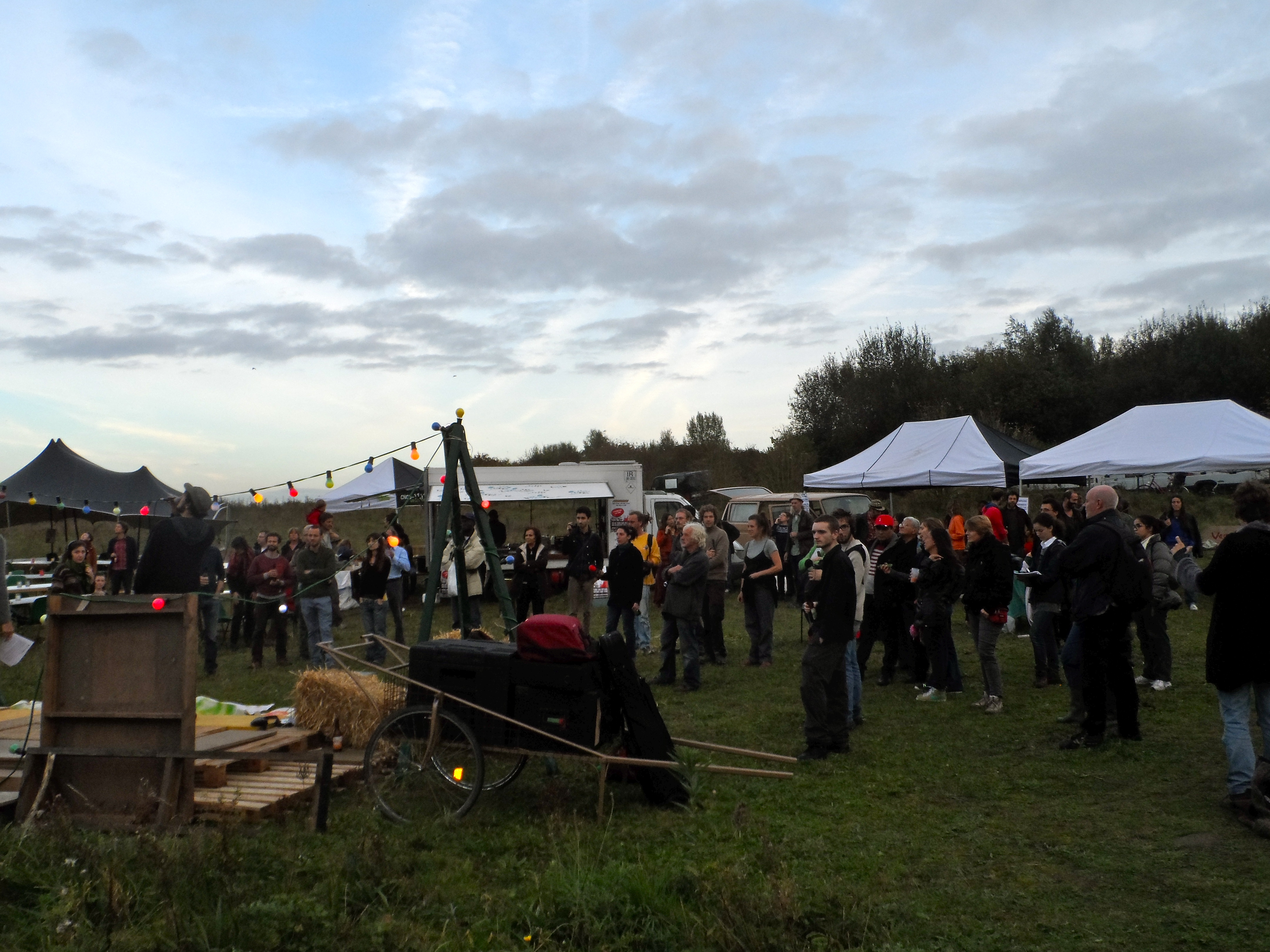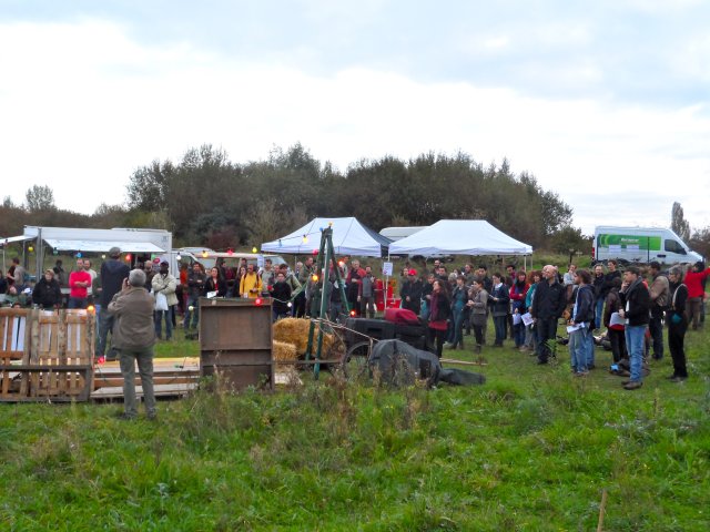 Ce vendredi 17 octobre, à Bruxelles, la lutte a continué et a fait un pas de plus sur le champ de Keelbeek, à Haren, celui-là même qui a vu naître les premiers élans patatistes. Tous invités à se réunir autour des patates plantées en avril, nous avons été quelques 200 personnes au rendez-vous  : à coup de bêche pour entretenir ce qui est devenu « notre terre » à force de lutte, à coup de fourchette pour partager un repas convivial, à coup de gueule pour dénoncer encore et toujours, à coup de tambours et de trompettes pour faire raisonner notre combat.